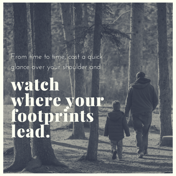 From time to time, cast a quick glance over your shoulder and look for your footprints. Watch where they lead. Towards God? Towards redemption? Towards the cross? Towards love? None of us are perfect people or perfect parents, so perfect footprints are impossible. Your footprints may meander, there may be moments when they run in circles, there may be times when they are deep and worn in from struggling to move forward. Perfect footprints are not our goal. Rather, it is the direction you are headed, and what you are using to guide your steps, that matters most. The destination, Christ, is where we must lead our children. The best we can do is head towards Him with repentance, love, hope, and grace in our hearts.